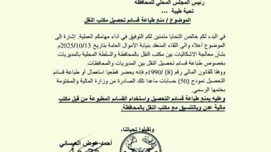 النقابي الجنوبي/ خاص قضت توجيهات رسمية صادرة عن الجهاز المركزي للرقابة والمحاسبة بالعاصمة عدن بمنع طباعة أو استخدام أي قسائم تحصيل مالية باسم مكتب النقل بالمحافظة ما لم تكن مطبوعة ومعتمدة من وزارة المالية وتحمل ختمها الرسمي. وكشف مدير…