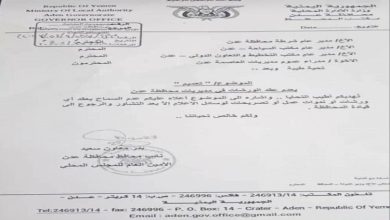 النقابي الجنوبي / خاص أصدر نائب محافظ عدن الامين للمجلس المحلي بمحافظة عدن بدر معاون تعميما تضمن توجيهات بعدم عقد ورشات العمل والادلاء بتصريحات اعلامية الا بعد التنسيق والتشاور مع قيادة المحافظة. ووجه نائب محافظ عدن الأمين العام التعميم…