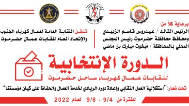 النقابي الجنوبي / خاص / إعلام | نقابة عمال كهرباء الجنوب رحب عمال كهرباء فرع منطقتي الديس الشرقية والريدة وقصيعر الواقعتان في الشريط الساحلي شرقي مدينة المكلا وكذلك عمال محطات التوليد بالمنطقتين صباح اليوم ، بالعملية الانتخابية التي تنظمها النقابة…