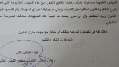 النقابي الجنوبي / خاص أصدر المكتب التنفيذي مجلس اللجان النقابية شركة النفط للعاصمة الجنوبية عدن برئاسة( ليندا عبدالله) بيانا يقول فيه بأنه المنتخب والحامل لترخيص رقم (٥٥٨) الصادر بتاريخ 24 / 1/ 2021م . وتضمن البيان عدم اعترافه بما…