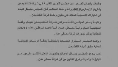 النقابي الجنوبي / خاص تبنى مجلس اللجان النقابية بشركة النفط العاصمة الجنوبية عدن التصعيد الاحتجاجي والذي تم صباح اليوم الاحد الموافق 21 مارس 2021م والمتمثل بالوففة الاحتجاجية امام بوابة المصفاة والكائن بالبريقة . وطالب المحتجون في وقفتهم بوقف تجاوزات…