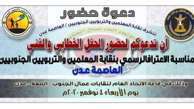 بمناسبة الاعتراف بها رسميا..نقابة المعلميين والتربويين الجنوبيين بالعاصمة عدن تدعوا للمشاركة في الحفل الخطابي والفني يوم غد الأربعاء