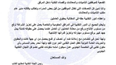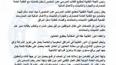 رئيس اللجنة النقابية لمطابع الكتاب المدرسي يعلن تضامنه مع النقابة العامة للمصارف والتجارة والتأمينات والأعمال المالية عدن بإقالة مدير عام التأمينات والمعاشات عدن