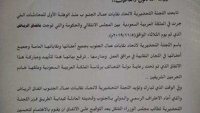 في بيان لها .. اللجنة التحضيرية لاتحاد نقابات عمال الجنوب تؤيد اتفاق الرياض وتعده بداية الطريق
