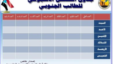 النقابي الجنوبي / متابعات قال الاستاذ جمال مسعود علي رئيس الدائرة الاعلامية للنقابة العامة للمعلمين والتربويين الجنوبيين بأنه تمت الموافقة على اصدار كرت جدول الحصص الاسبوعي للطالب الجنوبي كما هو مرفق بصورة . وأضاف مسعود ان النقابة اقرت تعميم…