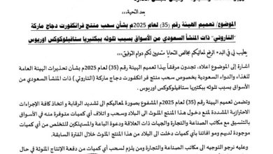 النقابي الجنوبي / عدن / خاص حذرت هيئة المواصفات والمقاييس وضبط الجودة، من استخدام منتج فرانكفورت دجاج “ماركة التاروتي” ذات منشأ سعودي، وحظرت دخوله الى البلاد ودعت الى سحبه من الاسواق بموجب التعميم الذي أصدرته اليوم الاثنين الموافق 22…