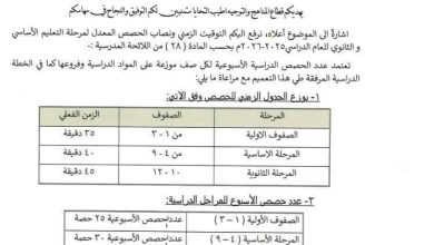 وزارة التربية تصدر تعميما بشأن التوقيت الزمني للحصص الدراسية في مختلف المراحل