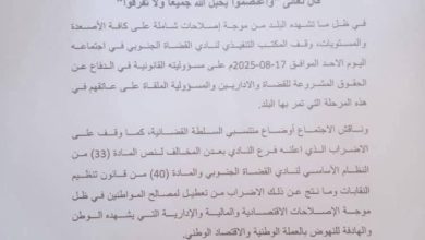 بيان هام صادر عن المكتب التنفيذي لنادي القضاة الجنوبي