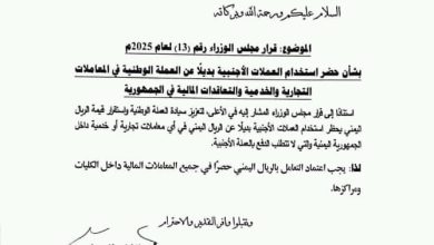 النقابي الجنوبي/عدن/إعلام الجامعة: أكدت جامعة عدن التزامها الكامل بقرار مجلس الوزراء رقم (13) لعام 2025م، القاضي بحظر استخدام العملات الأجنبية بديلاً عن العملة الوطنية في المعاملات التجارية والخدمية والتعاقدات المالية داخل الجمهورية. ووجه رئيس جامعة عدن في تعميم نواب…
