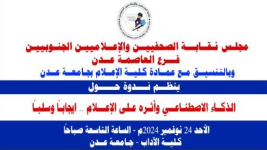 عدن.. تأثير الذكاء الاصطناعي على الاعلام ومناقشته بندوة علمية بنقابة الصحفيين الجنوبيين فرع عدن الاحد القادم