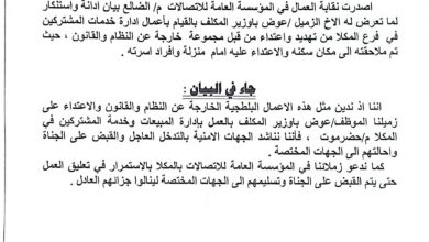 نقابة الاتصالات السلكية واللاسلكية الضالع تدين وتستنكر الاعتداء الذي طال عوض باوزير بالمكلا (بيان)