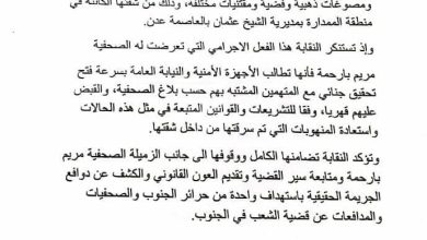 نقابة الصحفيين والاعلاميين الجنوبيين بعدن تعلن تضامنها الكامل مع الصحفية مريم بارحمة