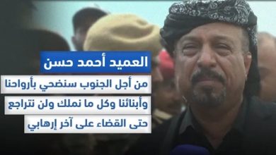 أثناء تشييع مهيب.. العميد المرهبي عن استشهاد نجله: من أجل الجنوب سنضحي بأرواحنا وأبنائنا
