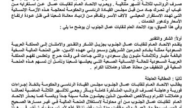 بيان نقابي هام.. الاتحاد العام لنقابات عمال الجنوب يصدر بيان رسمي بشأن تأخر صرف الرواتب والأوضاع الاقتصادية الراهنة