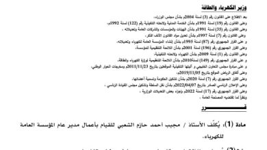 قرارا وزاري بتكليف مجيب الشعبي مديرا عاما للمؤسسة العامة للكهرباء