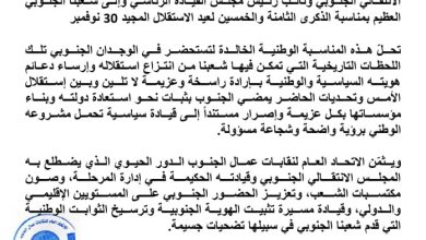 الاتحاد العام لنقابات عمال الجنوب يهنئ القيادة السياسية الجموبية بمناسبة ذكرى نوفمبر