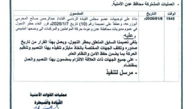 النقابي الجنوبي/خاص بناءً على توجيهات عضو مجلس القيادة الرئاسي، القائد عبد الرحمن صالح المحرّمي، تقرر إلغاء حظر التجوال في عموم مديريات العاصمة عدن، وعودة حركة المواطنين والمركبات إلى وضعها الطبيعي، ابتداءً من تاريخ صدور القرار. ونص التعميم الصادر…