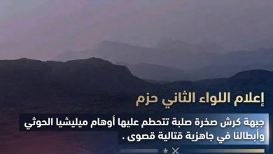 إعلام اللواء الثاني حزم: جبهة كرش صخرة صلبة تتحطم عليها أوهام المليشيا وأبطالنا في جاهزية قتالية قصوى