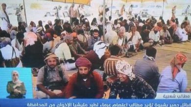 شبوة.. قبائل حمير تؤيد اعتصام عرماء وتطالب بطرد قوات الإخوان المتمردة من عارين