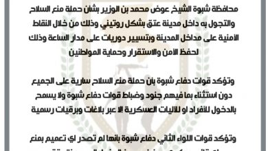 دفاع شبوة تصدر توضيح بشأن منع قيادات عسكرية من الدخول مدينة عتق