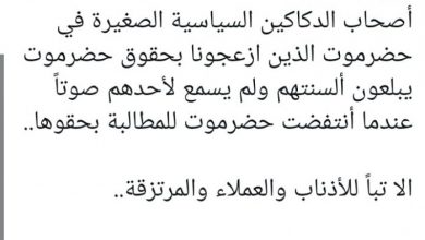 النقابي الجنوبي / خاص هاجم الشاعر الجنوبي عبدالله الجعيدي، عملاء الاحتلال اليمني في حضرموت، مؤكدا أنهم يتاجرون بحقوق المحافظة ويتوارون مع انتفاضتها. وقال في تغريدة على حسابه بموقع تويتر، اليوم إن: “أصحاب الدكاكين السياسية الصغيرة في حضرموت الذين أزعجونا بحقوق…