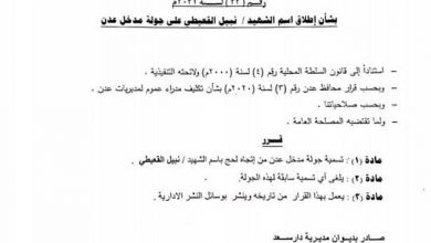النقابي الجنوبي /خاص/ عادل الجنسي اصدر الدكتور احمد عقيل باراس مدير عام مديرية دارسعد بالعاصمه عدن اليوم الخميس القرار رقم (22) لعام 2021م ، وقضت الماده الاولئ من القرار بتسمية جولة مدخل عدن من اتجاة محافظة لحج باسم المصور العالمي…
