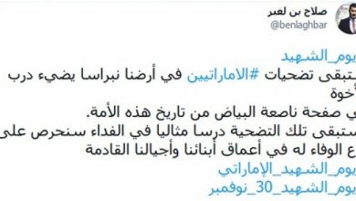 بن لغبر : تضحيات شهداء الإمارات بالجنوب درس مثالي في الفداء
