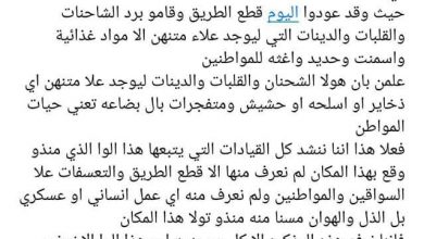النقابي الجنوبي / خاص/ ابو ملاك الحربي حذرت قبيلة آل دمان في مديرية لودر بمحافظة ابين في بيان لها قوات اللواء الثالث حماية رئاسية التابع لمليشيات الاخوان بقيادة لؤي الزامكي من نتائج قطع الطريق الرابط بين مديرية لودر ومحافظة البيضاء…