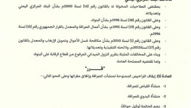 محافظ البنك المركزي يصدر قرارين بشأن سحب وإيقاف تراخيص عدداً من فروع شركات الصرافة وإغلاق مقراتها