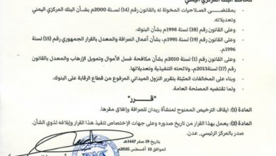 محافظ البنك المركزي يقرر إيقاف وسحب تراخيص فرع شركة ومنشأة صرافة وإغلاق مقريهما