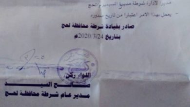 النقابي الجنوبي / خاص اصدر اللواء الركن صالح السيد مدير عام أمن محافظة لحج أمراً إدارياً قضى بتكليف الملأزم أول ياسين سعيد محمد فريد جهضر مديراً لأمن مديرية المسيمير خلفاً لشقيقه الراحل احمد جهضر الذي انتقل الى جوار ربه إثر…
