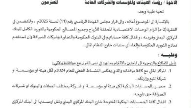 وزارة المالية توجه بإغلاق حسابات الجهات الحكومية في البنوك التجارية وتحويلها إلى البنك المركزي عدن