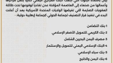 تفادياً للعقوبات الأمريكية.. البنك المركزي يعمم أسماء البنوك التي قررت نقل مراكزها من صنعاء اليمنية إلى العاصمة عدن