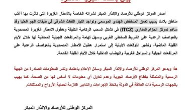 بيان صادر عن المركز الوطني للأرصاد والإنذار المبكر
