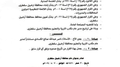 محافظ سقطرى يصدر قراراً بشأن تكليف مستشاراً لمدير عام مكتب التربية والتعليم بالمحافظة