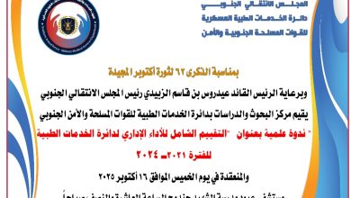 دائرة الخدمات الطبية للقوات المسلحة والأمن الجنوبي تُعلن عن موعد إقامة الندوة العلمية