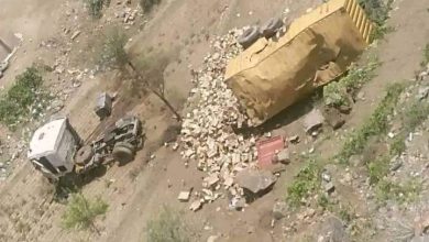 “كارثة مرورية تضرب طريق حيفان في تعز: انقلاب شاحنة يتسبب في إصابة سائقها ودمار حمولتها!”
