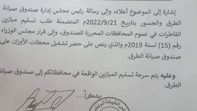 النقابي الجنوبي /خاص اصدر اللواء عيدروس الزبيدي رئيس اللجنة العليا للموارد المالية نائب رئيس مجلس القيادة الرئاسي رئيس المجلس الانتقالي الحنوبي قرار بتسليم ميازين القاطرات إلى إدراة صندوق صيانة والطرق. ووجه الرئيس الزبيدي محافظي المحافظات المحررة بتسليم ميازين القاطرات…