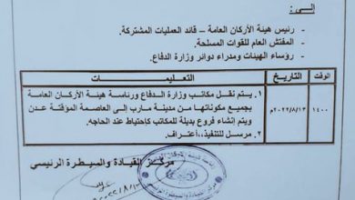 النقابي الجنوبي /خاص اصدر الفريق الركن / محسن الداعري توجهيات رسمية قضت نقل وزارة الدفاع من مارب اليمنية الى العاصمة الجنوبية عدن واكدت وثيقة صادرة من رئاسة هيئة الأركان العامة بوزارة الدفاع متضمنة توجيهات وزير الدفاع بنقل مكاتب وزارة…