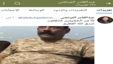 النقابي الجنوبي / خاص علق القيادي الرافضي ( عبدالقادر المرتضى) رئيس لجنة شؤون الأسرى التابعة المليشيات الرافضية الإرهابية في تغريدة له( بتويتر ) بأية قرآنية تتحدث عن الانتقام ( انا من المجرمين منتقمون) ، وذلك بعد ساعة من استشهاده،الامر…