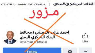 مصدر مقرب من محافظ البنك المركزي للنقابي الجنوبي : تزوير باسم محافظ البنك في (تويتر وفسيبوك) انتحالا للشخصية ونؤكد نفيها.