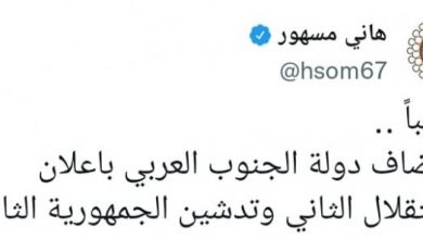 النقابي الجنوبي / خاص بشر المحلل والكاتب الصحفي هاني مسهور، شعب الجنوب، حيث توقع إعلان دولة الجنوب العربي قريبا، تتويجا لنضال شعب الجنوب، وتضحياته ضد الاحتلال اليمني الغاشم. وكتب في تغريدة على حسابه بموقع التدوين المصغر تويتر، اليوم أن: “قريباً…