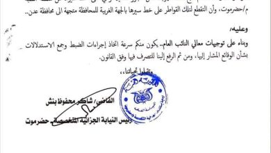 كشفت وثائق رسمية أن النيابة الجزائية المتخصصة بحضرموت وبحسب توجيهات النائب العام قد أمرت إدارة أمن حضرموت بسرعة اتخاذ إجراءات الضبط وجمع الاستدلالات في وقائع التقطع للقواطر التي تحمل نفط خام أو وقود تتبع محطات الكهرباء، ومن بينها تلك القواطر…