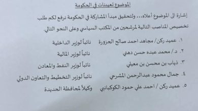 هدد بتجميد عضويته ان لم تنفذ مطالبه.. (طارق عفاش) يقدم مذكرة ل (رشاد العليمي) تشمل مقاعد في الحكومة(وثيقة)