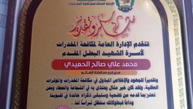 الاداره العامه لمكافحة المخدرات بوزارة الداخليه تكرم أسرة الشهيد المقدم محمد الحميدي بدرع التضحية