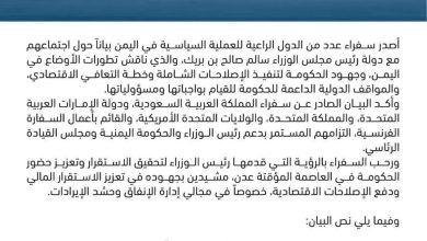 - سفراء الدول الراعية يجددون دعمهم للحكومة ويشيدون برؤية بن بريك للإصلاح والاستقرار في عدن